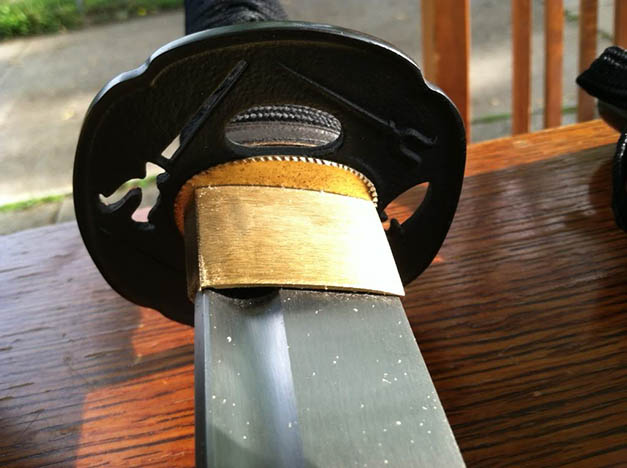 I am very impressed with the tsuka, but as I have said before the Tsuka seemed to have shrunk a little, the fuchi shifts somewhat, and the Samegawa (rayskin) on the Ura (back) side has also shrunk, causing it to expose the Tsuka core and climb over the mekugi pegs.