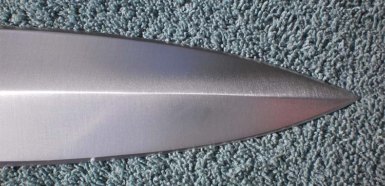 The tip is nicely pointed - it's not a needlework tip, but I imagine it would take quite a bit of effort or abuse to get this to roll, considering the obvious reinforcement of it. This would have been ideal were the sword made of bronze or iron