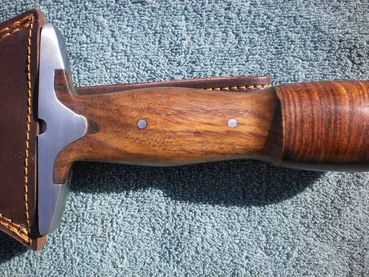 The tang is pinned between two nicely polished pieces of unspecified hardwood. It's shaped nicely with a good palm swell in the 'grip' area. Even if you have large hands, the 'pommel' gives you additional grip room (as well enabling you to employ a handshake style grip). I don't see this ever becoming a point of failure.