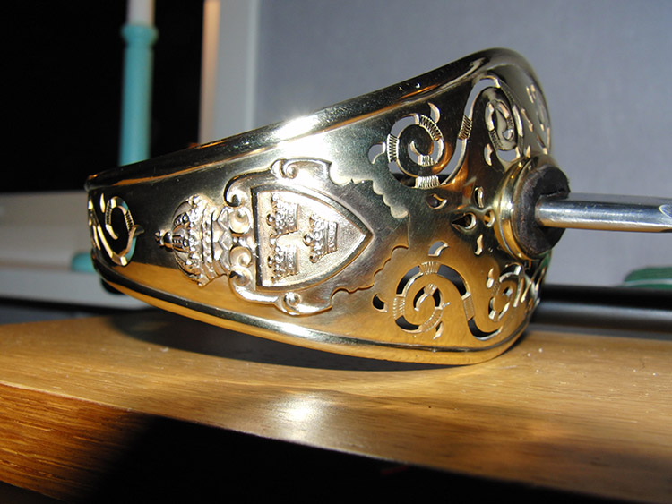 This is actually very easy to restore a nice shine to the brass fittings of a sword - all you need is one product - Brasso! Here is the result..