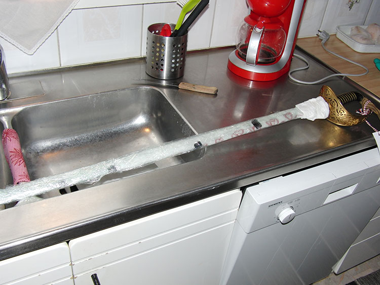 The worst part is the blade sadly, quite a bit of rust and pitting in the area around the tip... Around a third of the blade is affected with the rust lessening towards the handle. This just won't do for celebrating a wedding, and to know how bad/deep the rust really is it has to be removed so I know how much of the blade will have to be reground. I started by wrapping the blade in rags dipped in a weak rust eating acid.